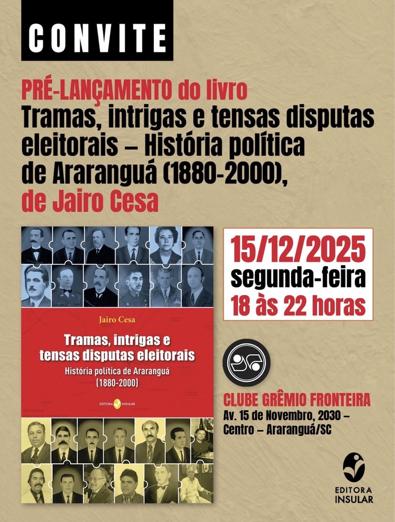 A historiografia dedicada à política de Araranguá ganha novas cores e tensões na obra “Tramas, intrigas e tensas disputas eleitorais: história política de Araranguá-SC (1880-2000)”, do historiador araranguaense Jairo Cesa. Fruto de duas décadas de pesquisa incansável, o livro com 640 páginas rompe paradigmas, confronta versões consolidadas e devolve voz a personagens esquecidos (as) pela historiografia tradicional.