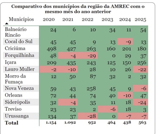 O baixo desempenho da mesorregião em setembro não reflete os números da Região Carbonífera, que fechou o mês com 563 empregos formais acrescentados, superando o saldo de 2023 (464) e o de 2024 (438).