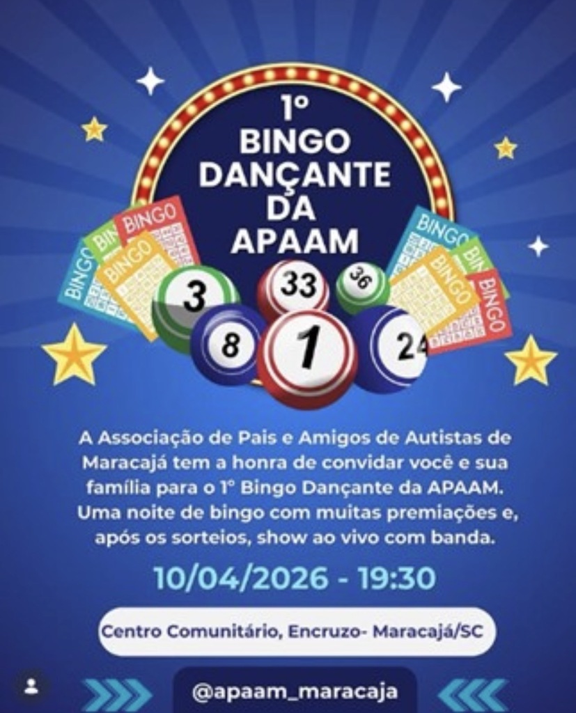 Para fortalecer a associação na cidade, a diretoria e apoiadores organizaram o 1º Bingo Dançante da APAAM, que será realizado no dia 10 de abril, com início às 19h30, no Centro Comunitário de Encruzo, em Maracajá. Mais informações e reservas de cartelas podem ser feitas pelo WhatsApp: (48) 99805-7980, com Suzi, do setor de Marketing e Comunicação da APAAM. Atualmente, a presidente da APAAM é Ana Caroline.