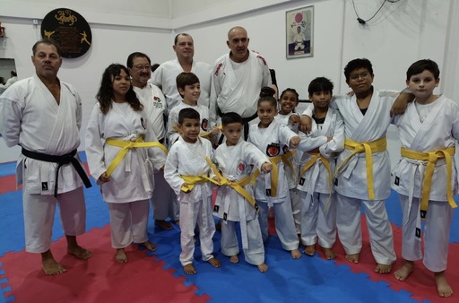 A banca examinadora que concedeu as novas faixas avaliou os alunos por grupos. Foram observados os movimentos e técnicas nas exibições de kata e fundamentos. Todos foram aprovados e a troca das faixas emocionou vários pais.